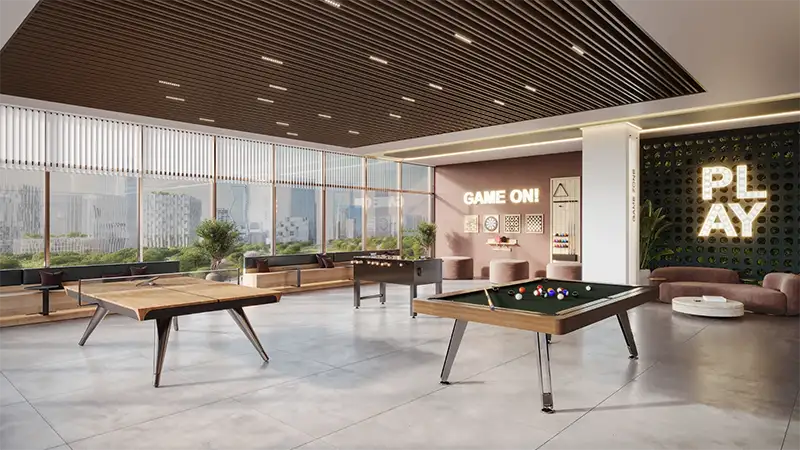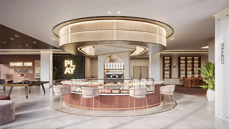 - Integrated amenities: gym, pool, yoga zones, podcast studios, breakout spaces